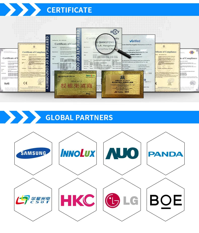 As an export-oriented supplier in China, we have a complete qualification certificate, not only to ensure product quality clearance, but also for you in the purchase of TV open cell panels or machine-related products, clear customs and destination countries of government supervision obstacles, smooth import, smooth business activities. Different countries require different certificates, please contact our professional TV open cell panel sales staff in advance for the latest information.